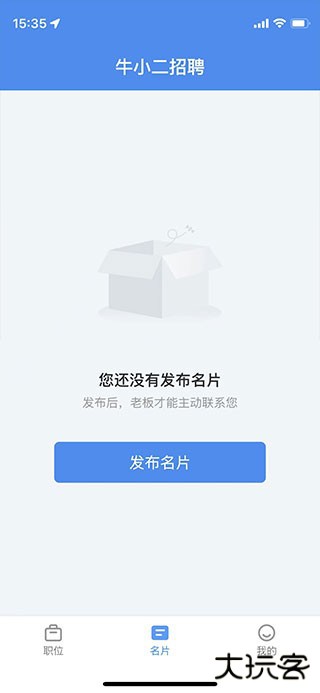 1、打开牛小二招聘app,点击最下方中间的名片