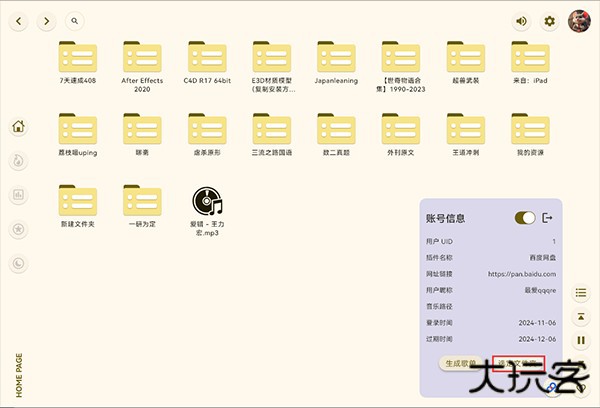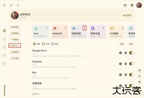 1、在设置中选择“插件中心”按钮,点击网盘右上角的纵向三点标记。