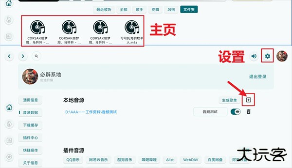 2、在右上角的设置里,打开音源数据,你可以通过旁边的“+”图标添加本地音乐文件,添加完后,主页里就会显示本地音乐了。