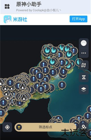 2、提瓦特地图:可以在应用内查看全部的提瓦特地图,还能显示出游戏内的标点