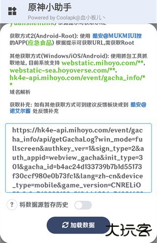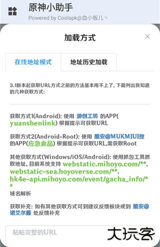 2、在加载方式页面中选择在线地址模式,往下滑,只需要在框内粘贴完整的URL;获取URL的方式:可以使用游创工坊的yuanshenlink应用,根据提示就可以获取链接,随后输入链接,点击加载数据;