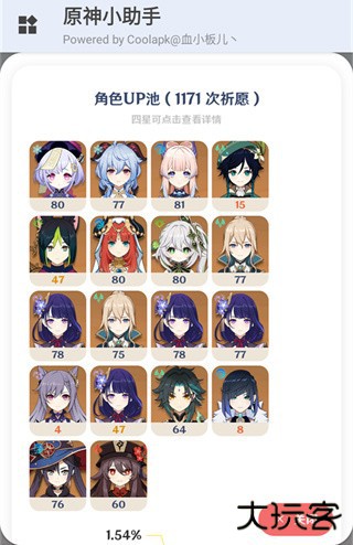 5、点击按池子:细分为角色up池和武器up池以及常驻up池。有图表视图与文字视图两种,图表视图可以很直观地看出抽卡详情;文字视图简单直接,可以得知自己角色池子的欧皇程度;