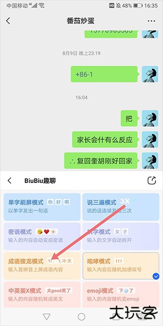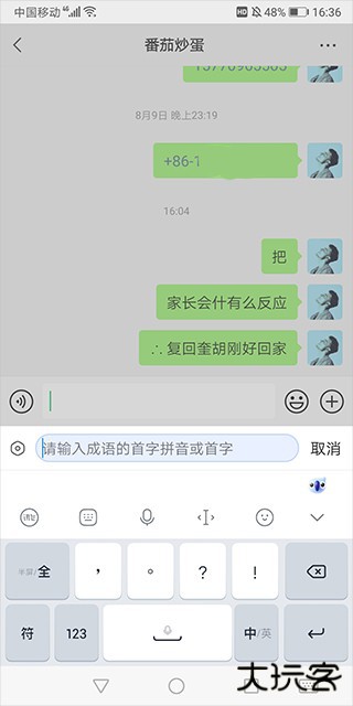 3、输入“一”,就会发送出以一打头的成语。