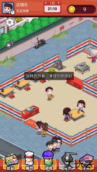 4、雇佣团队系统:玩家可招募多样化厨师来优化美食生产效率与质量,并能添置收银、打杂等角色,提升全局服务效能。