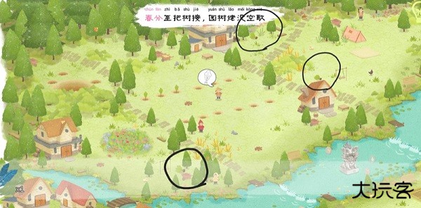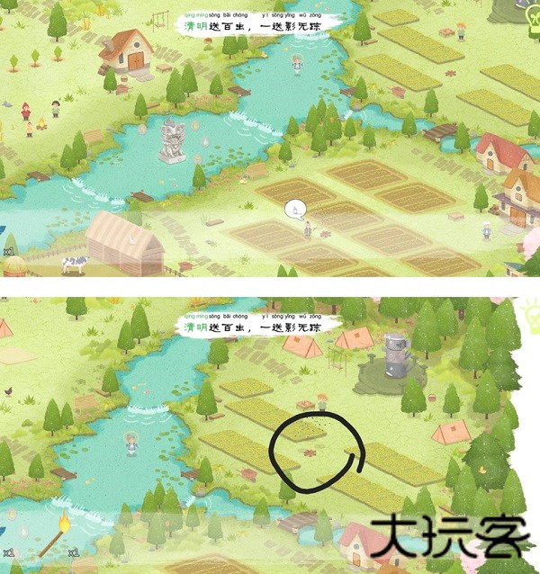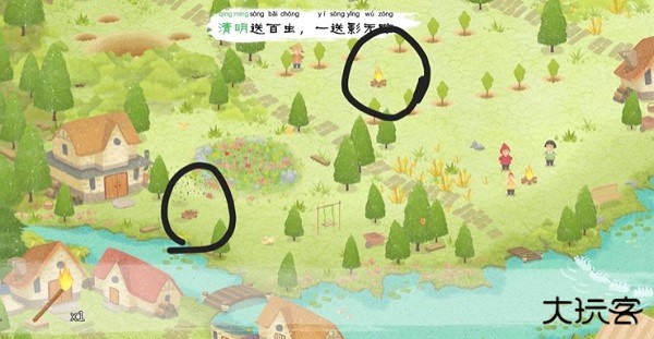 8、找到小孩手中所持细小木棍(需放大画面观察)。获取木棍后移动至河对岸的指定火堆处(火堆位置参考图示)引燃,再将燃着的木棍交还小孩。随后将视角移至画面右上角的品茶者位置。