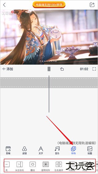 9、点击【转场】,可以对多个视频之间进行转换操作。