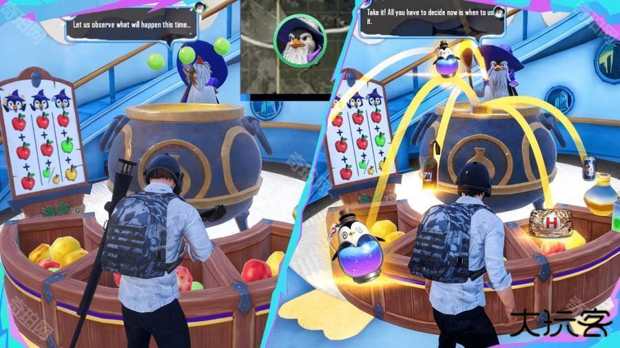 ●炼药师企鹅(普通):与企鹅互动后,它会随机拿出3个苹果药材炼药;同色苹果越多,掉落的物资与变身药水奖励越丰富!小机率触发「炸锅」事件,此时会产出大量企鹅魔药。