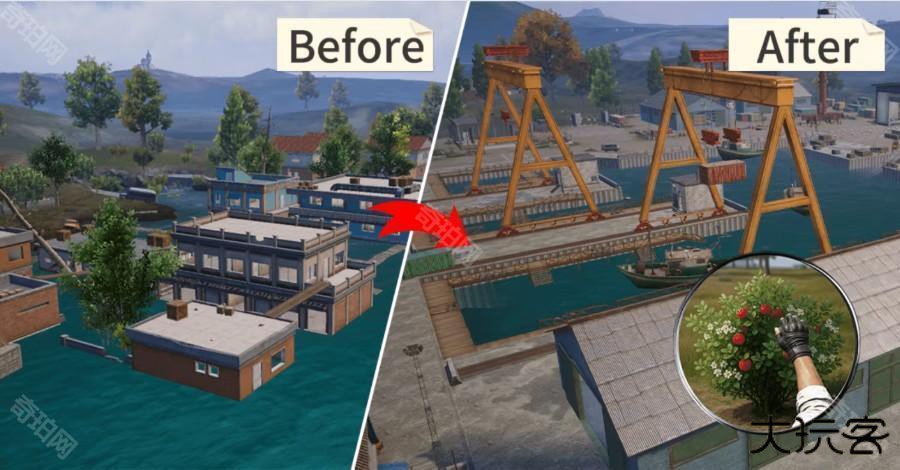 ●Erangel地图新增Boatyard港口:位于Rozhok与Ruins区域之间的水浸村庄已重建,升级为全新港口区域Boatyard。此区域的整体布局经过改善,并且增设多栋新建筑,现已在小地图直接显示名称,帮您快速定位及规划战术路线。