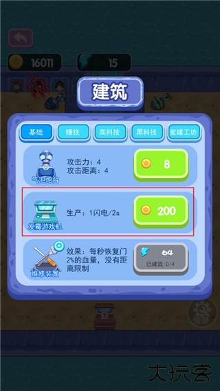 9、当中期升级项目出现能量需求时,应建造发霉游戏机以获取能量资源。进入游戏后期,推荐建造维修器,此建筑能自动修复周边受损防御设施。