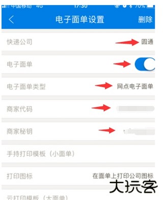 4、选择快递公司,打开电子面单开关,选择相关电子面单类型(支持网点电子面单和菜鸟电子面单),输入商家代码和秘钥(代码和秘钥需要找上级网点询问),然后选择打印模板、云打印木板等设置,然后保存。