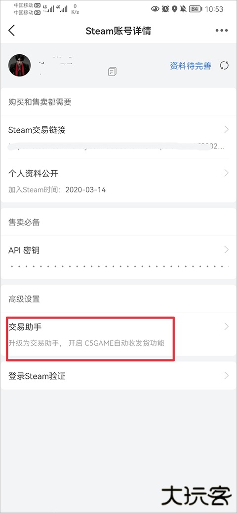 1、如上述第二条操作,进入【我的 Steam】下的账户详情页面。 在账户详情页内,定位并点击【交易助手】功能入口。