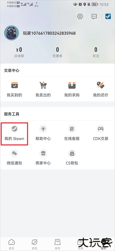 1、在 C5Game 应用中,点击底部导航栏【我的】, 在【服务工具】区域点击【我的 Steam】。