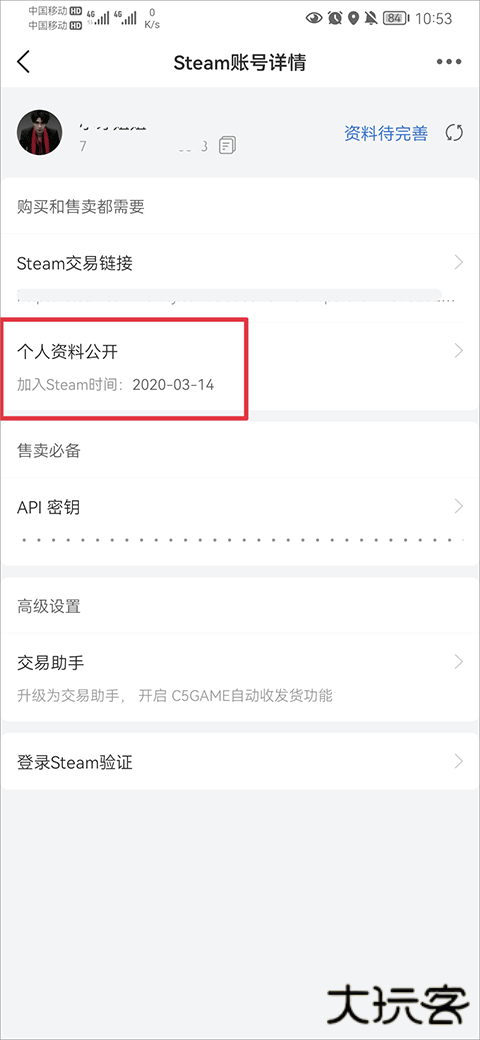 2、进入 Steam 账户详情页面后,定位【个人资料公开】选项并点击。