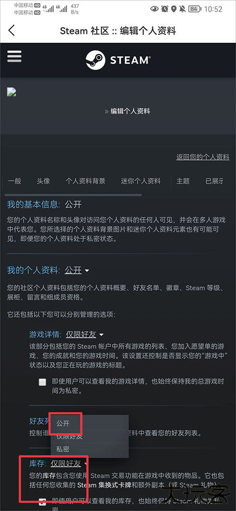 2、如需身份验证,请登录您的 Steam 账户。 登录成功后进入编辑个人资料页面。 在隐私设置区域,找到【库存】选项。 将库存隐私权限设置为【公开】状态并确认保存。