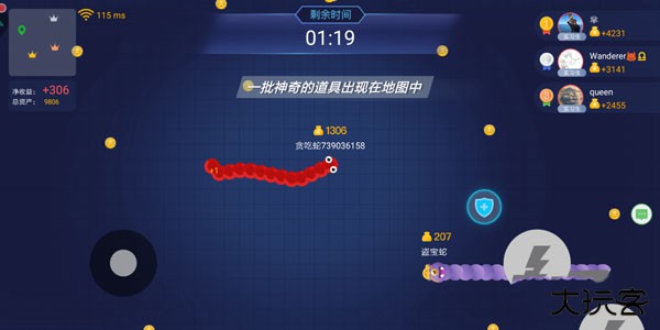 每局比赛中一共有十个玩家,一局时长为三分钟。玩家在收集欢乐币的同时也要注意别被其他玩家击杀,被击杀会失去所有已收集到的和本身投注的欢乐币。海盗蛇会携带大量欢乐币,要记得小心消灭对方。在游戏中还会随机刷新道具,要注意抢先下手。