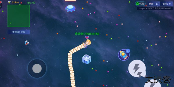 在地图中还会遇到其他玩家的小蛇,头部撞到其他小蛇也会导致死亡。要消灭敌蛇需要用身体去撞击,消灭后可吃下敌蛇的豆子来增加自身的长度。