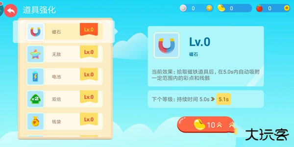 在挑战模式中,玩家在游戏中获得的金豆将用于道具的强化,而得分越高则最后结算时获得的金豆将越多。