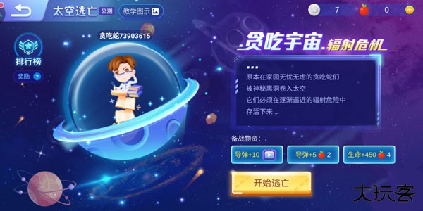 在太空逃亡中玩家可以体验一把在太空中进行游戏的感觉。在这种模式中,安全区域会逐渐缩小,活到最后是唯一的目标。一局游戏中共有29名玩家,安全区为绿色,辐射区则为红色。小蛇的头部在辐射区会受到持续伤害,要注意躲避辐射伤害进入安全区。