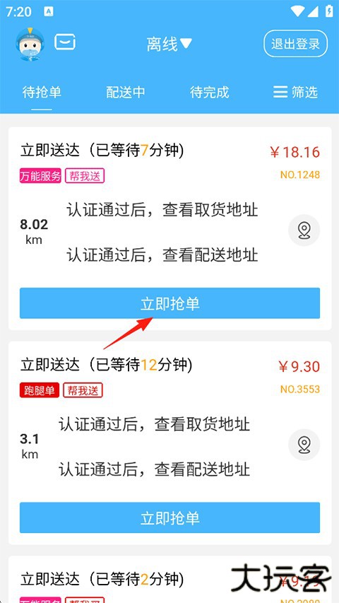 1、打开登录抖送骑手版,在首页点击立即抢单;