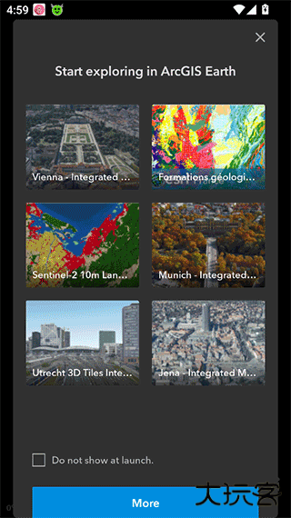 1、进入app后,不用使用魔法等待一段时间就会让用户选择卫星影像图的数据平台,这里如果需要加载中国国家地理数据公共平台天地图的数据可以点击【MORE】