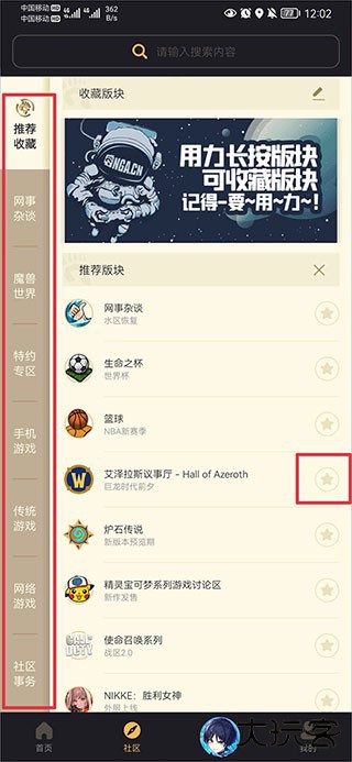 1、打开NGA玩家社区app,点击最下方的社区,选择喜欢的板块(点击版块右边的星星图标还可以对版块进行收藏)