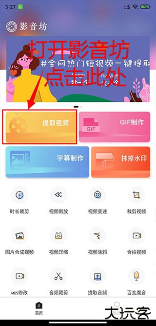 2、打开影音坊应用,点击“提取视频”功能。