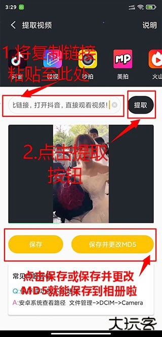 3、在输入框中粘贴刚才复制的链接,点击“提取”。提取成功后即可保存无水印视频。