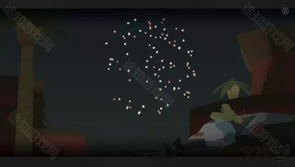 6、山上坐着一只大鸟,还是按照一样的步骤,点燃烟花,吞掉,移动到山下黑色影子的地方,烟花轰炸白色的大鸟。这个步骤需要重复2到3次,最终山崖会被轰断,大鸟掉下来。