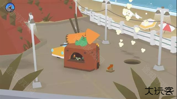 7、大鸟旁边的篮子里装着玉米、还有一个火堆。掉下来以后一起吃掉,地洞就又会爆出很多的爆米花。