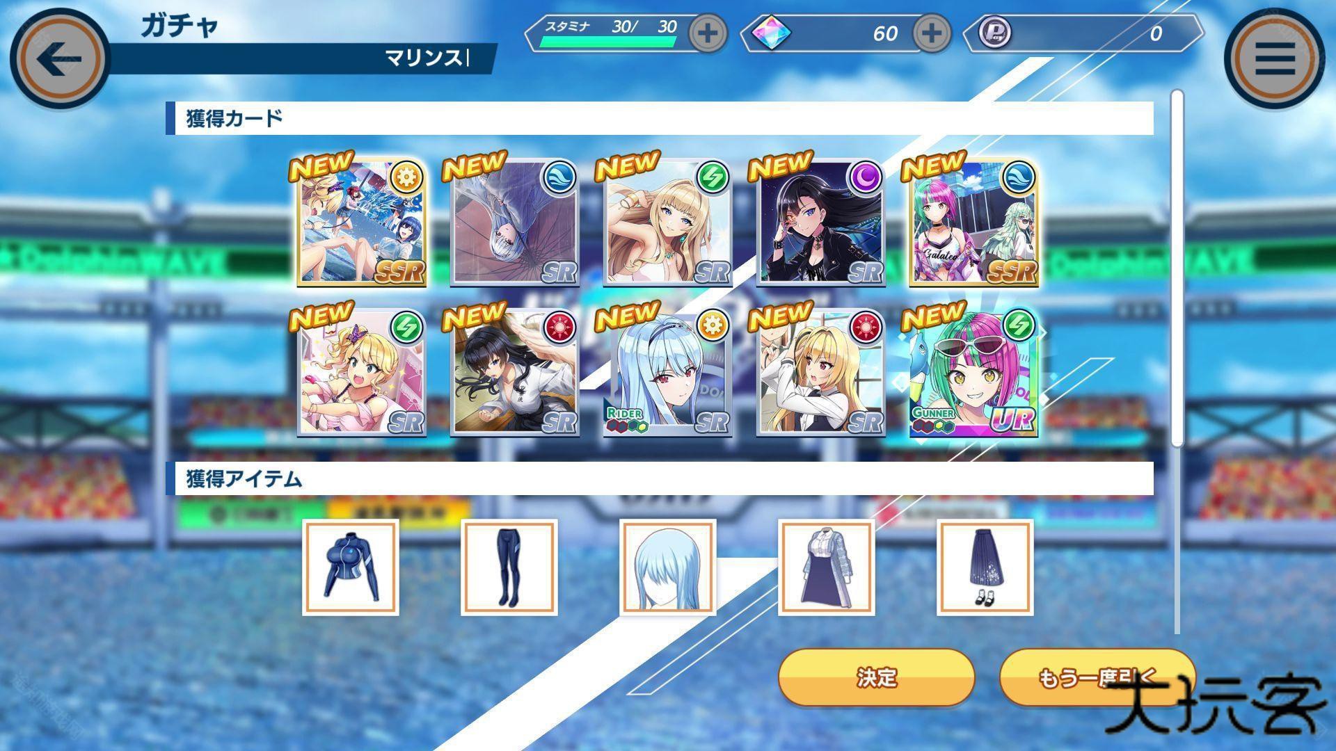 4、新手教学结束后的抽卡可以确定入手1名UR的海豚选手,并且可以无限重抽。刷到自己主推的UR与SSR角色+SSR~UR 的回忆(装备)以后,就能以更快乐的方式进行游玩了,