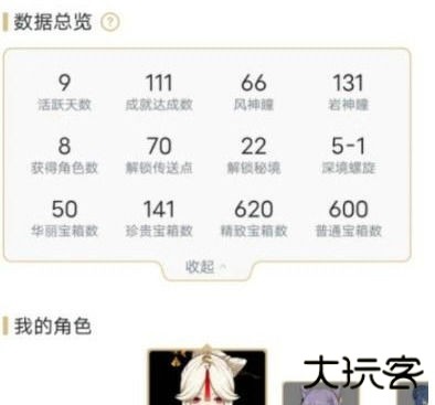 活跃天数、成就完成数量、风神瞳及岩神瞳的收集情况、获得的角色数量、解锁的传送点、解锁的秘境、深境螺旋层数、开启的宝箱数量(华丽宝箱、珍贵宝箱、精致宝箱、普通宝箱均有显示)