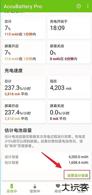 2、进入页面后在充电页面点击右侧下方的设置设计容量