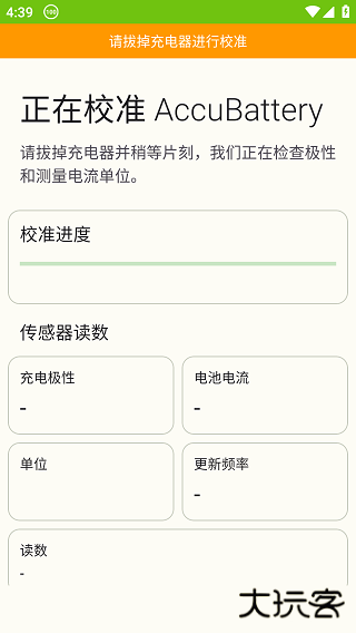 1、在本站下载安装accubattery电池检测器,进入软件页面将提示请拔掉充电器进行校准哦