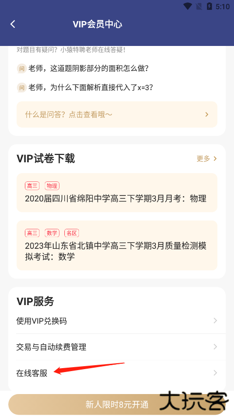 2、进入VIP会员中心界面后,把页面拉到最低端,找到在线客服并点击它即可。