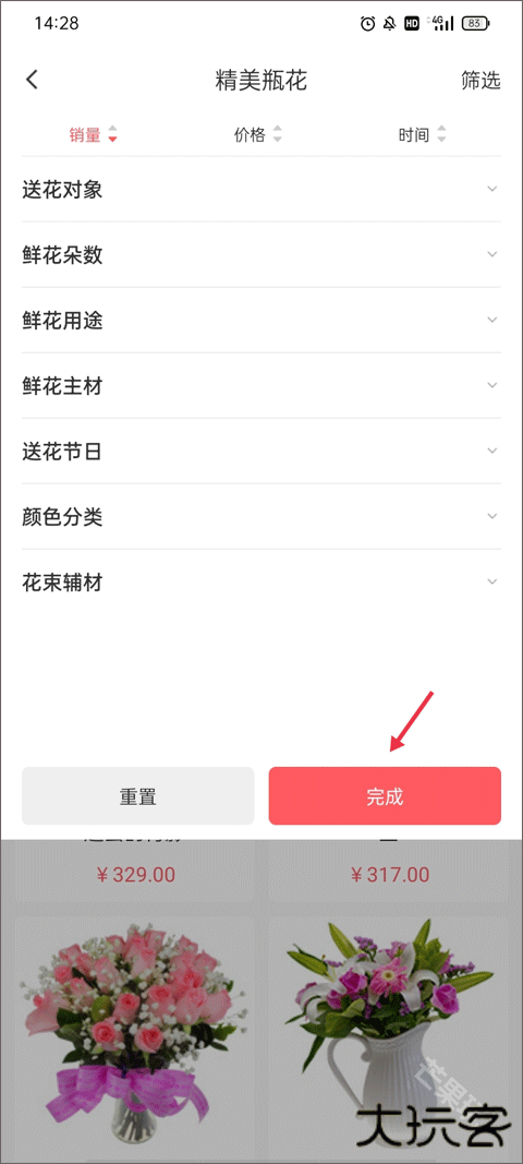 2、点击右上角的“筛选”按钮,从送花对象、鲜花朵数、鲜花用途等多个条件来找到自己想要订购的鲜花