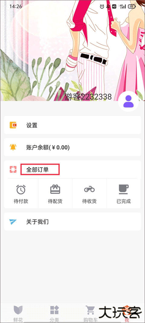 1、打开鲜花网app,点击右下角【我】,然后点击“全部订单”
