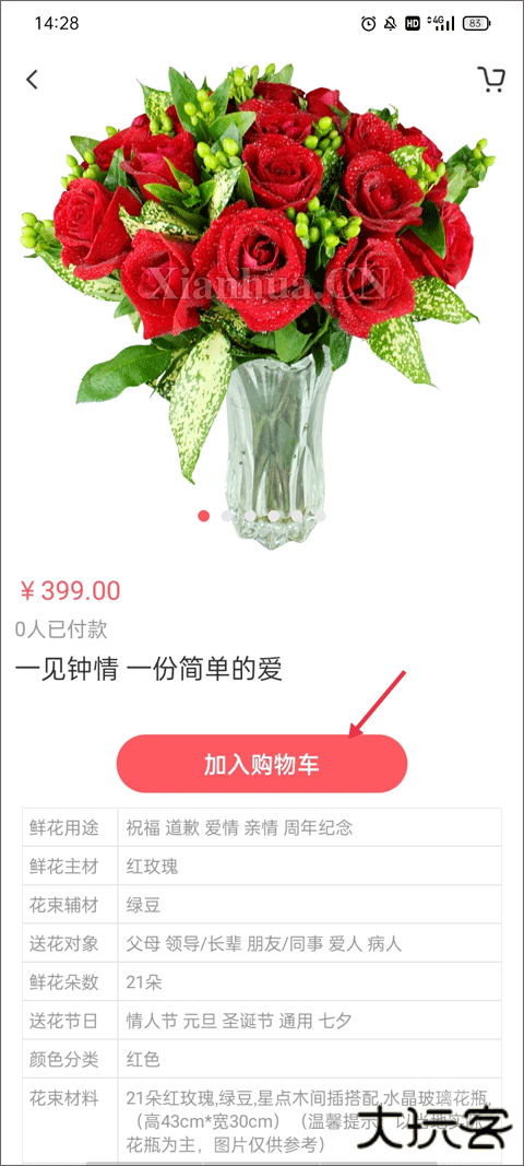 4、可以查看商品的图片展示、鲜花价格等相关信息,然后点击最下方中间的“加入购物车”