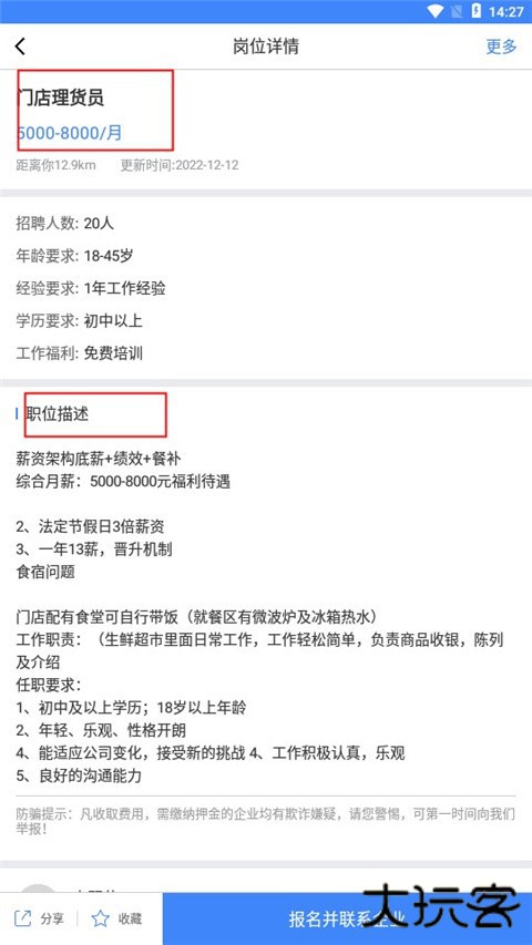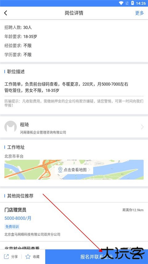 4、进入岗位详情,查看各个岗位的详细描述内容,了解岗位工作地址和工作环境。
