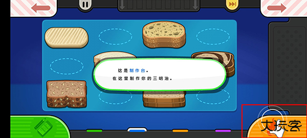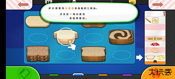 6、下图所示即为“制作台”,这这里可以制作你的三明治,萨沙想要用白面包来做她的三明治,点击这一堆白面包,来选择面包;