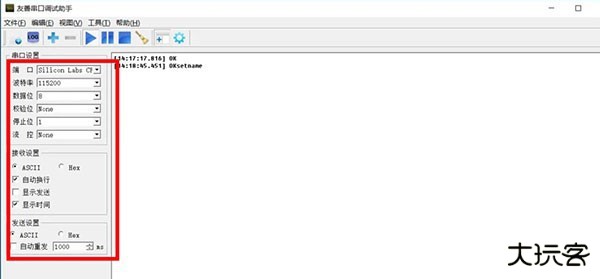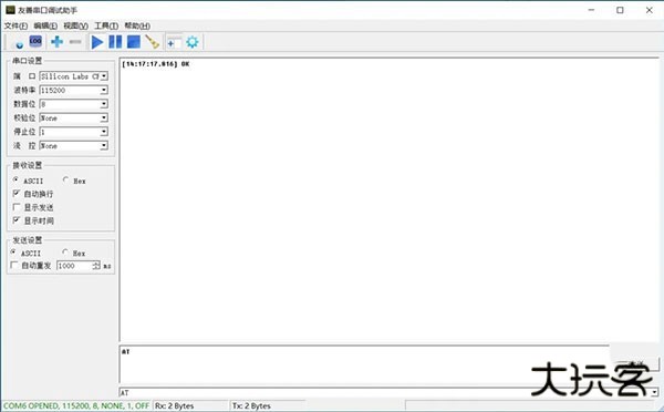 2、打开友善串口调试软件,打开COM口,输入AT指令发送过去,如果连接正常且硬件是好的,这里会蓝牙串口返回OK回来。
