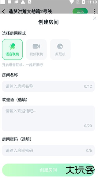 4、选择房间的模式、输入房间名称、欢迎语等,房间密码,最后点击创建房间