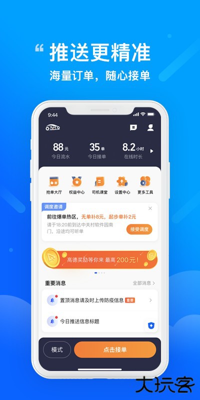 2、简洁易用:界面功能布局清晰,一键出车/收车,语音播报订单。