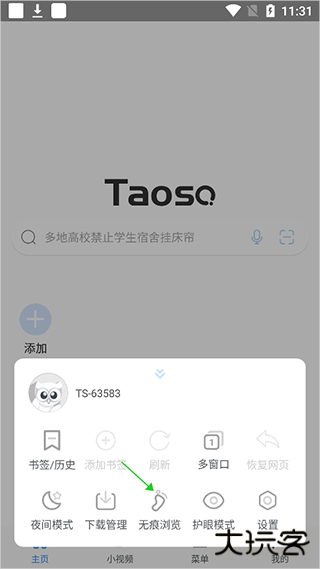 2、接着点击底部弹出的选项框中的【无痕浏览】