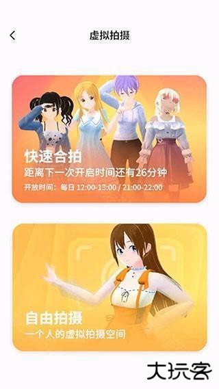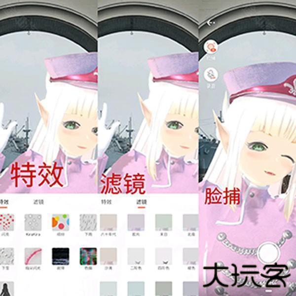 5、在主页点击“虚拟拍摄”,就可以帮你的角色拍摄照片。你可以任意调节特效与滤镜。还可以使用脸捕,目前是脖子与头能根据屏幕前的你的动作进行变化。