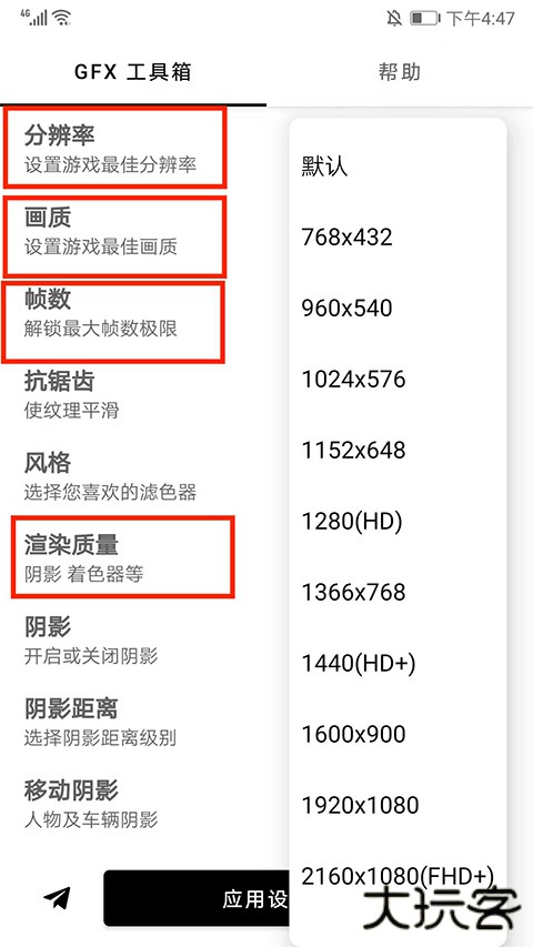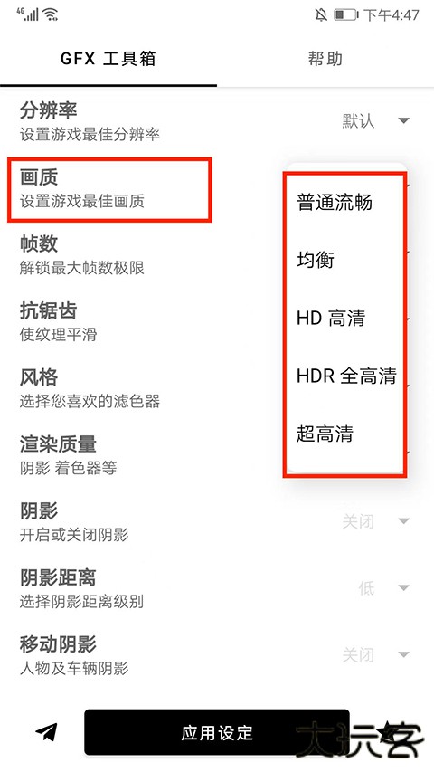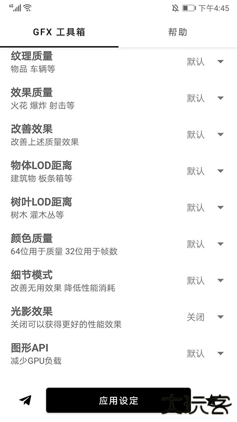 暗区突围gfx工具箱就是gfx工具箱,已经升级更新到了2024安卓最新版本,支持的游戏也多样,像暗区突围、吃鸡等游戏都兼容,玩家可以在线修改分辨率、画质、帧数、阴影、游戏画质风格等,使用全程十分简单,用户打开游戏后就能直接在平台上修改设置游戏参数,感受最极致的游戏体验