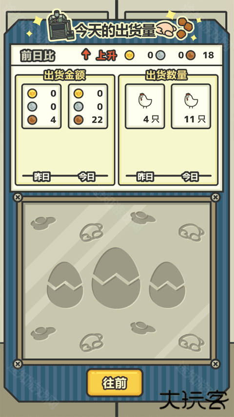 3、游戏本身有着昼夜循环系统,白天为生产时间,持续三分钟,在这短短的三分钟里,你可以点击一下使机器工作时间缩短10秒,使小鸡更快成长更快卖出去赚更多的钱。同时你还可以放生价格低的鸡让昂贵鸡种进到鸡栏里生蛋。三分钟结束后还会跳出营业报告,告诉你总共卖了多少只鸡赚了多少钱,还会和昨天进行对比,可谓是十分励志了。