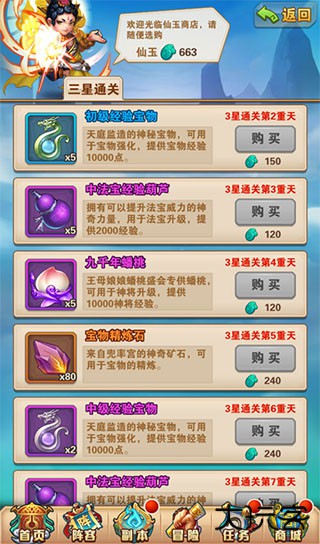 挑战过程中可即时获得银两、仙玉、装备图纸、宝石及法宝升级所需葫芦。