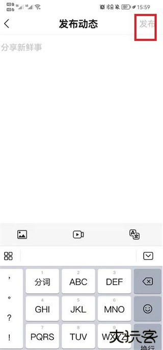 3.输入要发布的内容,添加图片和视频,然后点击右上角的发布选项