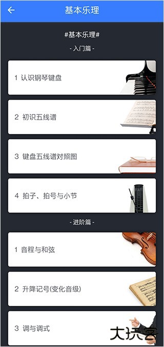 1、下载后打开进入app,软件内提供了大量的乐理知识可以学习