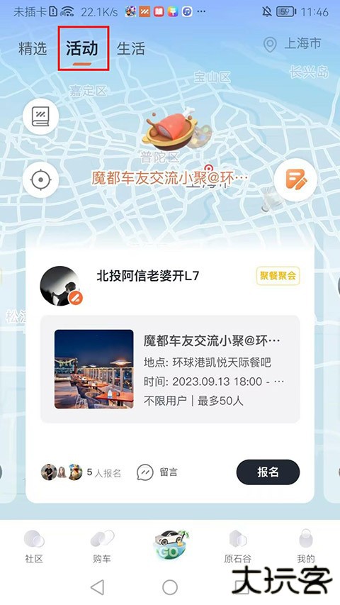 2、在地图中点击用户头像获取具体活动内容,选择感兴趣的活动报名即可